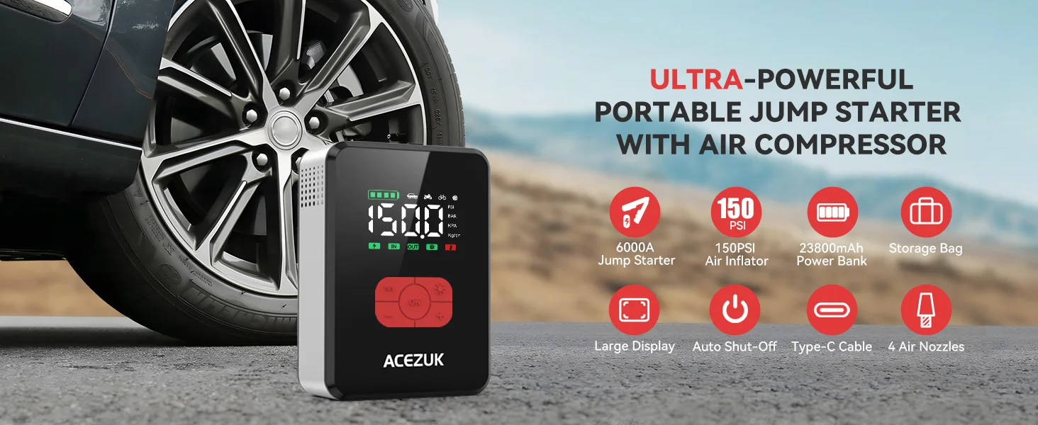 ACEZUK 2025 Kit Tyre Inflator with Jump Starter and Digital Screen