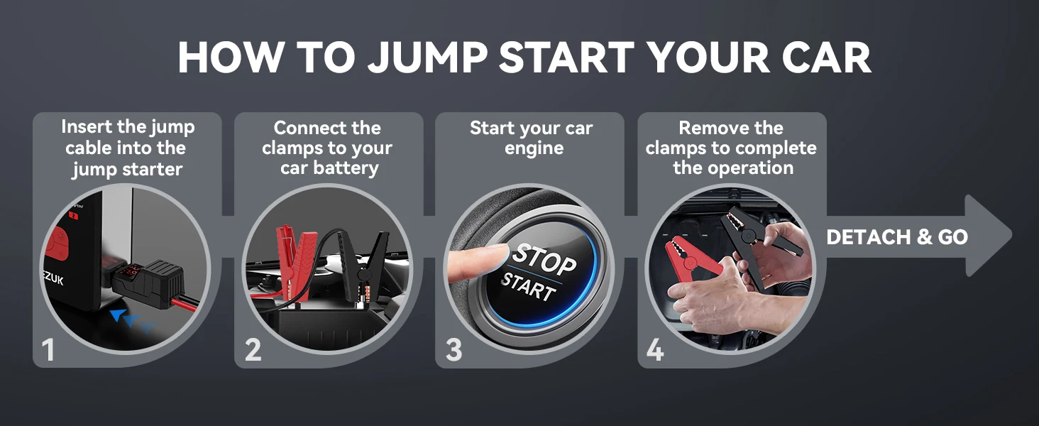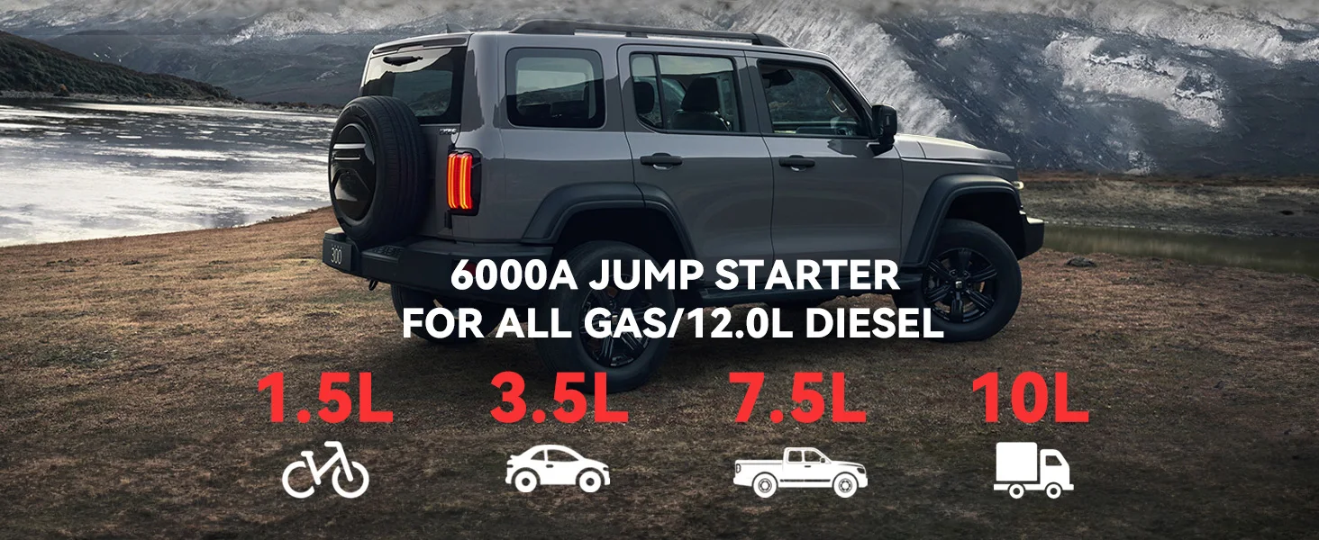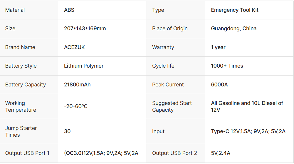 ACEZUK Kit Tyre Inflator with Jump Starter and Digital ScreenThis super compact jump starter is of small size and easy to carry, it can jump start 12v engine vehiles all gasoline and under 12L diesel 30 times at a full charged status. It is also equiped with a light of normal, SOS, warning mode. It also can be considered as a power bank with multiple outputs in emergency situation. All of above make this jump starter a good helper on the driving.