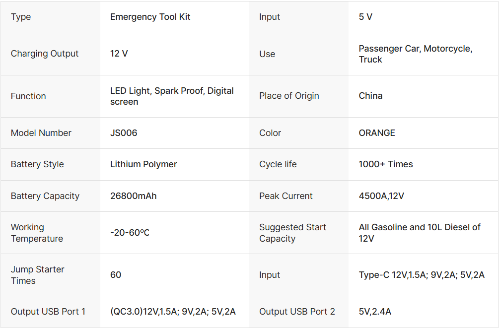26800MAH Emergency Jump Starterwith air Pump and Power Bank Emergency LightingThis super compact jump starter is of small size and easy to carry, it can jump start 12v engine vehiles all gasoline and under 10L diesel 60 times at a full charged status. It is also equiped with a life hammer and light of normal, SOS, warning mode. It also can be considered as a power bank with multiple outputs in emergency situation. All of above make this jump starter a good helper on the driving.