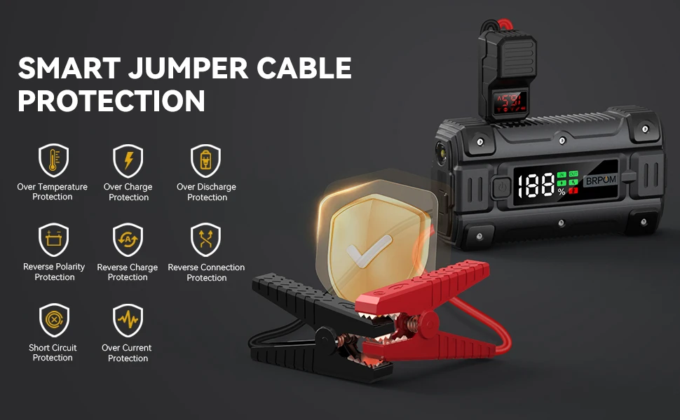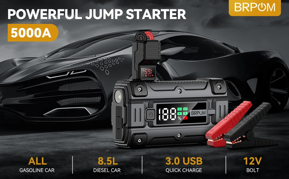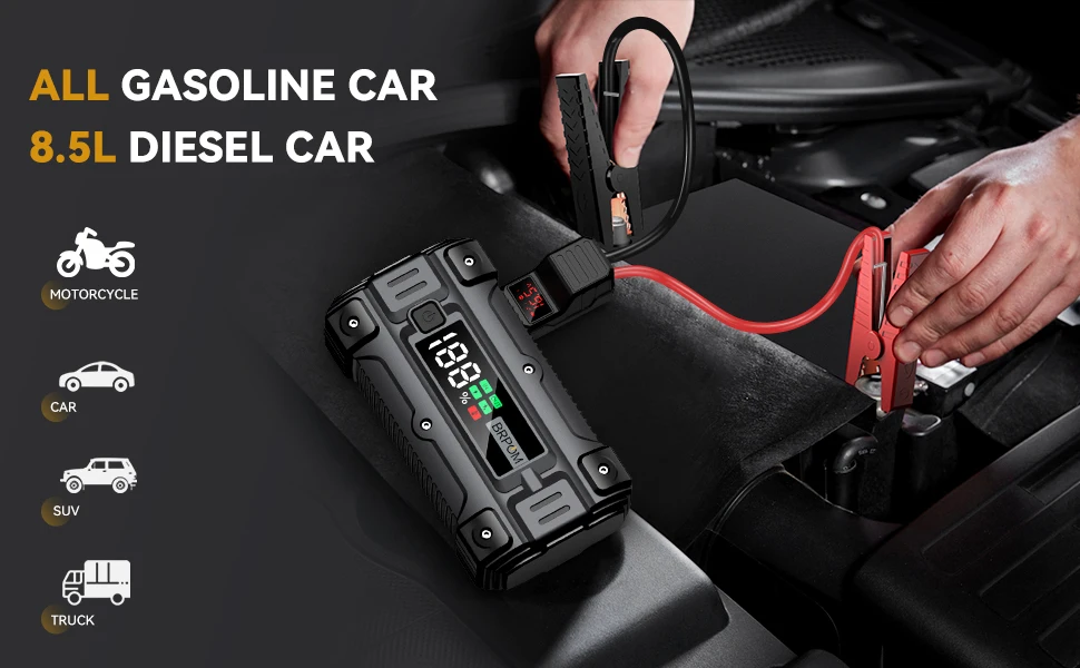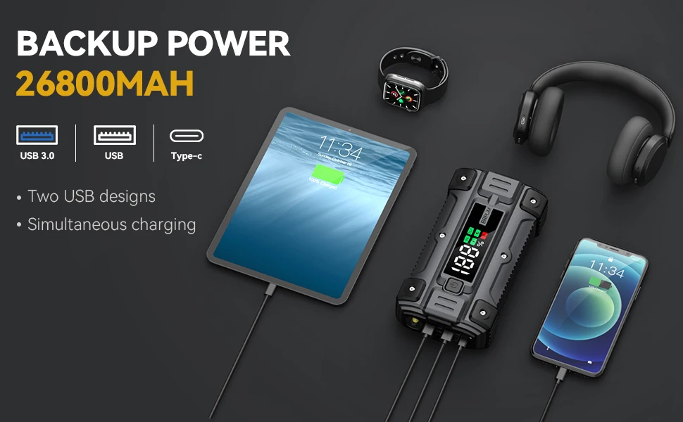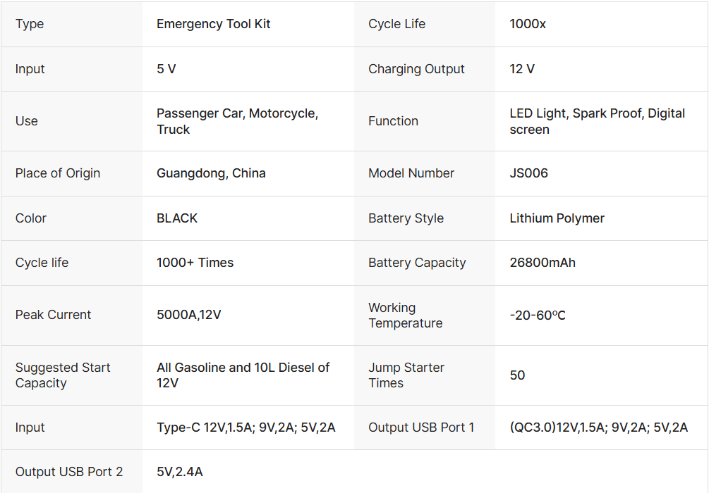 26800MAH Emergency Jump Starterwith air Pump and Power Bank Emergency LightingThis super compact jump starter is of small size and easy to carry, it can jump start 12v engine vehiles all gasoline and under 10L diesel 60 times at a full charged status. It is also equiped with a life hammer and light of normal, SOS, warning mode. It also can be considered as a power bank with multiple outputs in emergency situation. All of above make this jump starter a good helper on the driving.