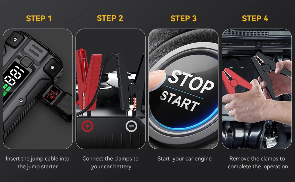 4, Remove the clamps and pack them away.Notes: If vehicles don’t restart on the first trial, disconnect the clamps and wait for 30 second, the have one more trial.