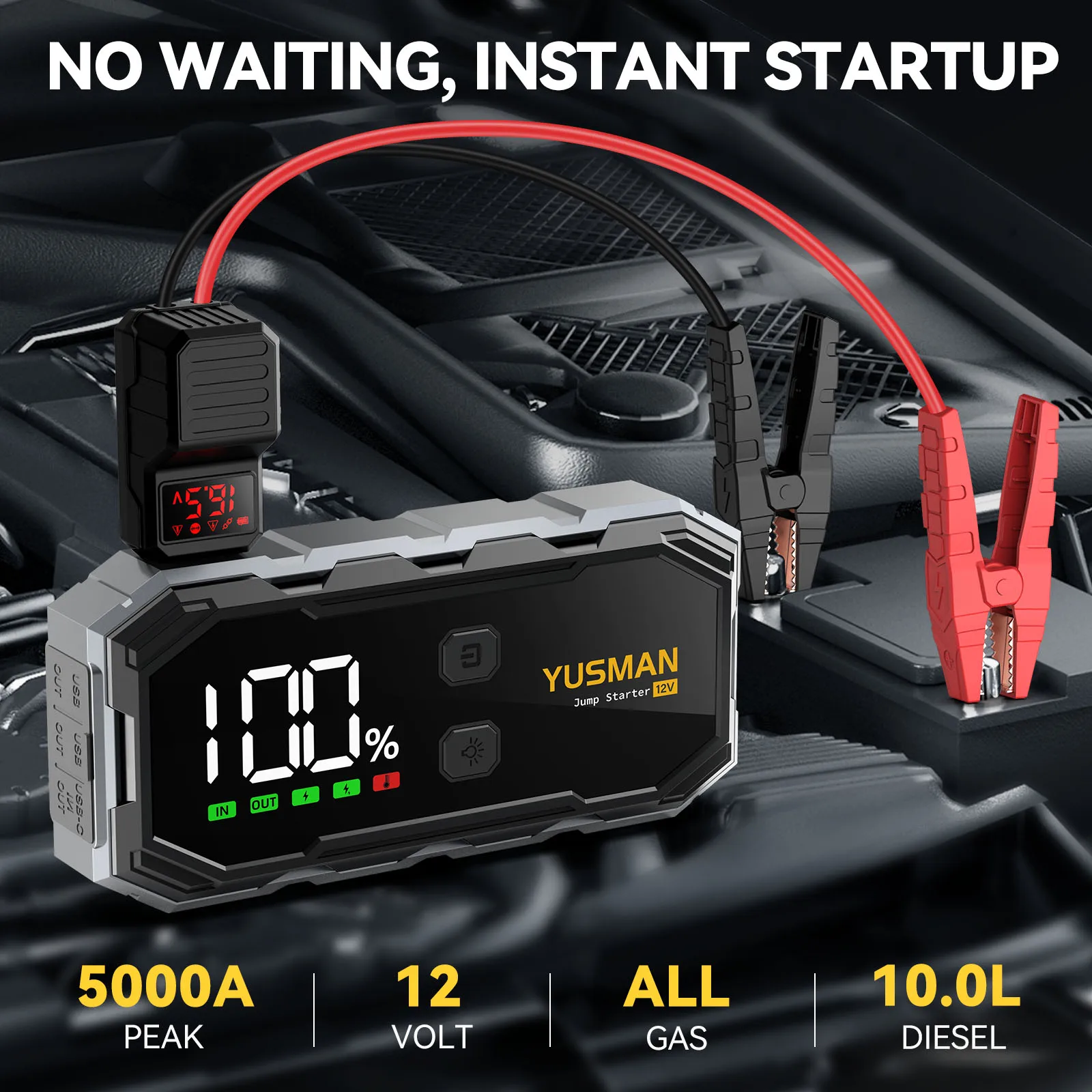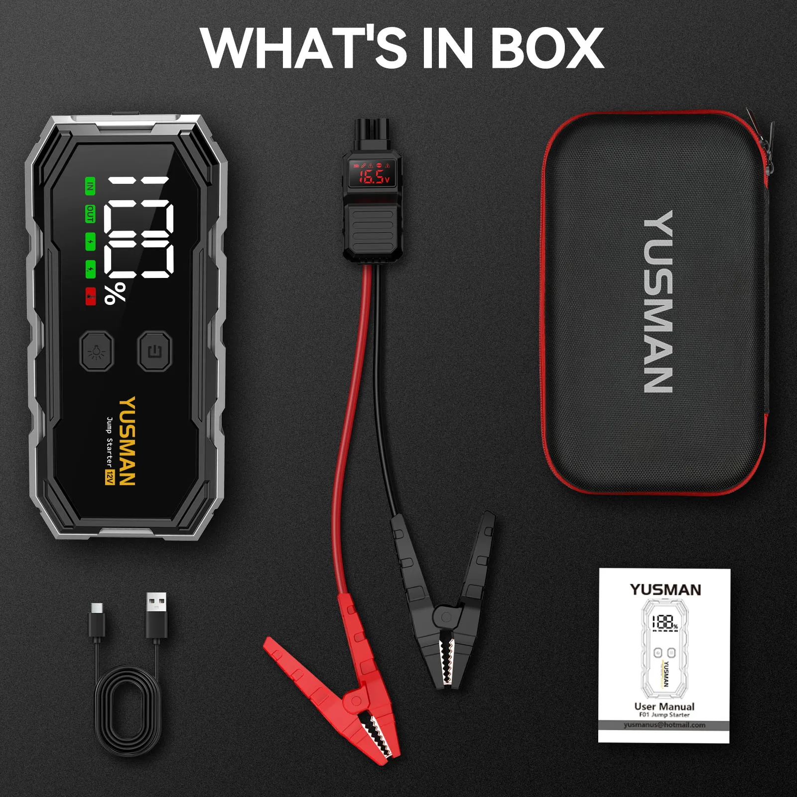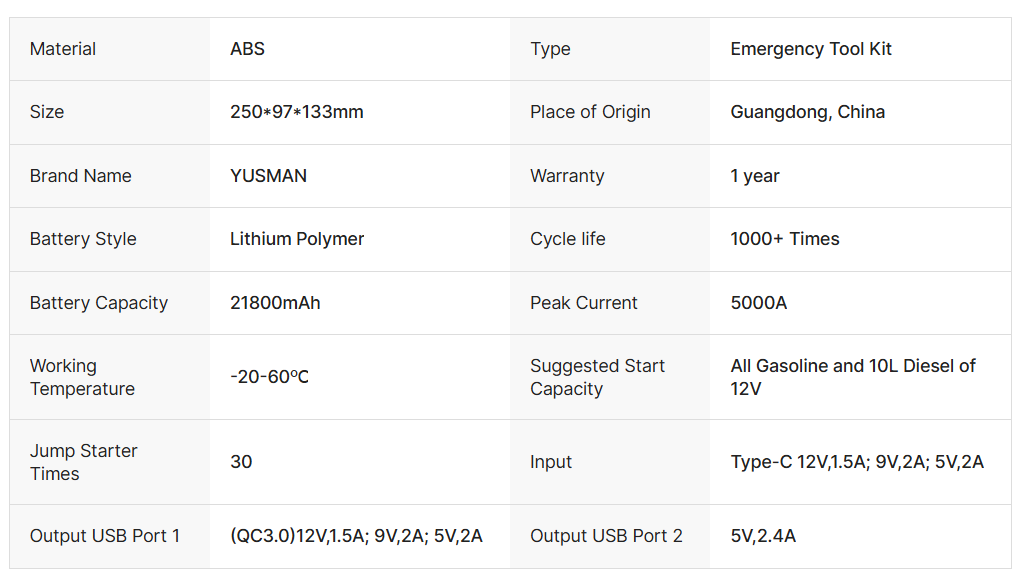 YUSMAN Mini Jump Starter with Cable and LED LightThis super compact jump starter is of small size and easy to carry, it can jump start 12v engine vehiles all gasoline and under 10L diesel 30 times at a full charged status. It is also equiped with a life hammer and light of normal, SOS, warning mode. It also can be considered as a power bank with multiple outputs in emergency situation. All of above make this jump starter a good helper on the driving.